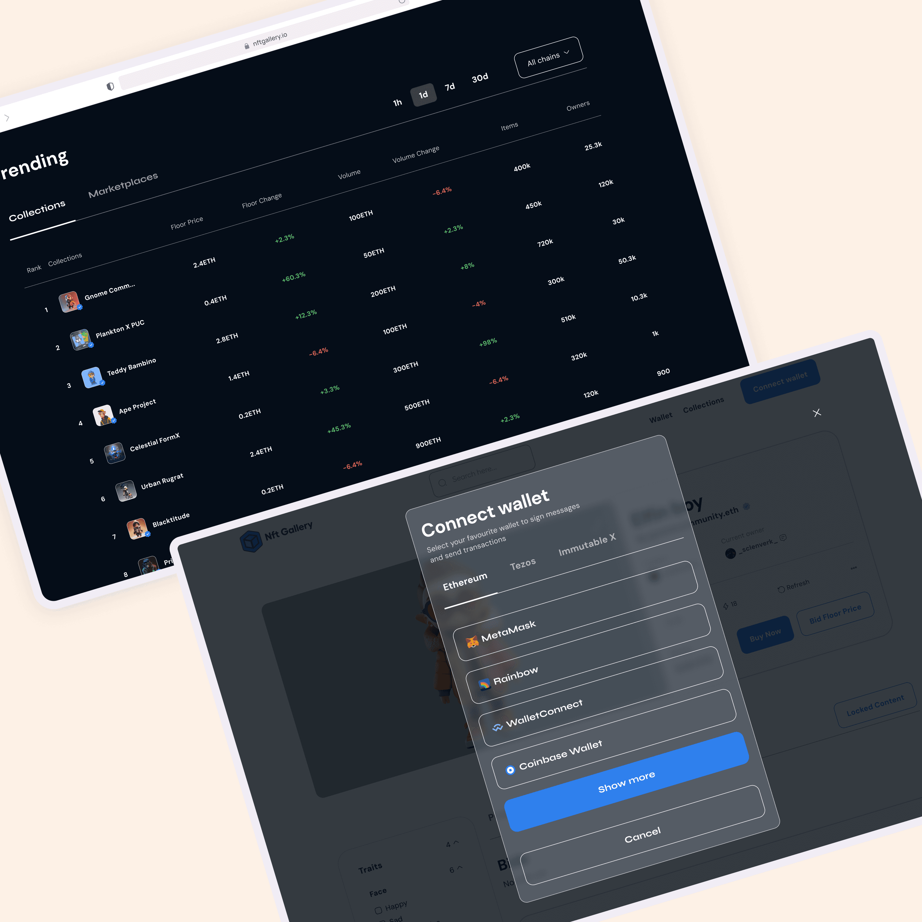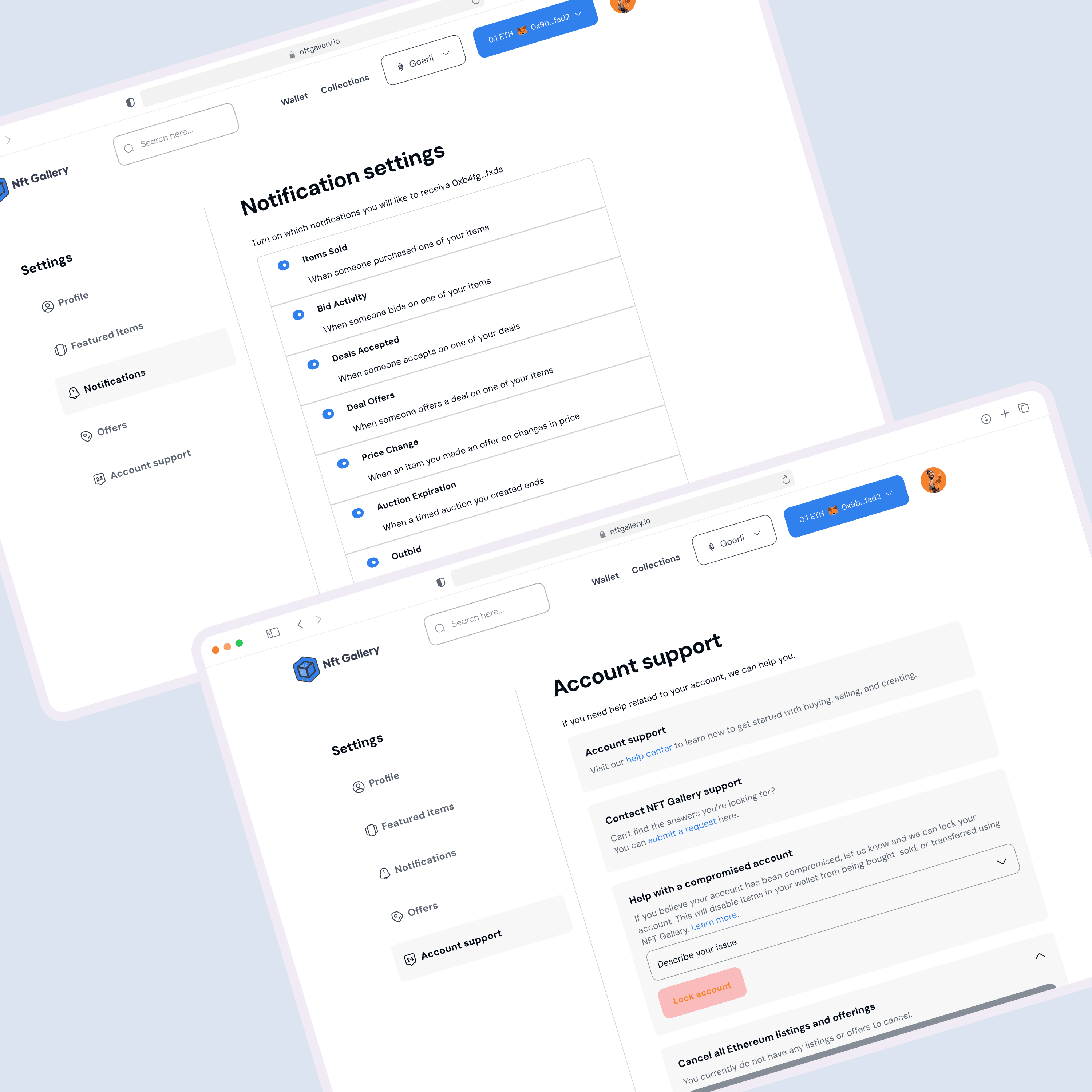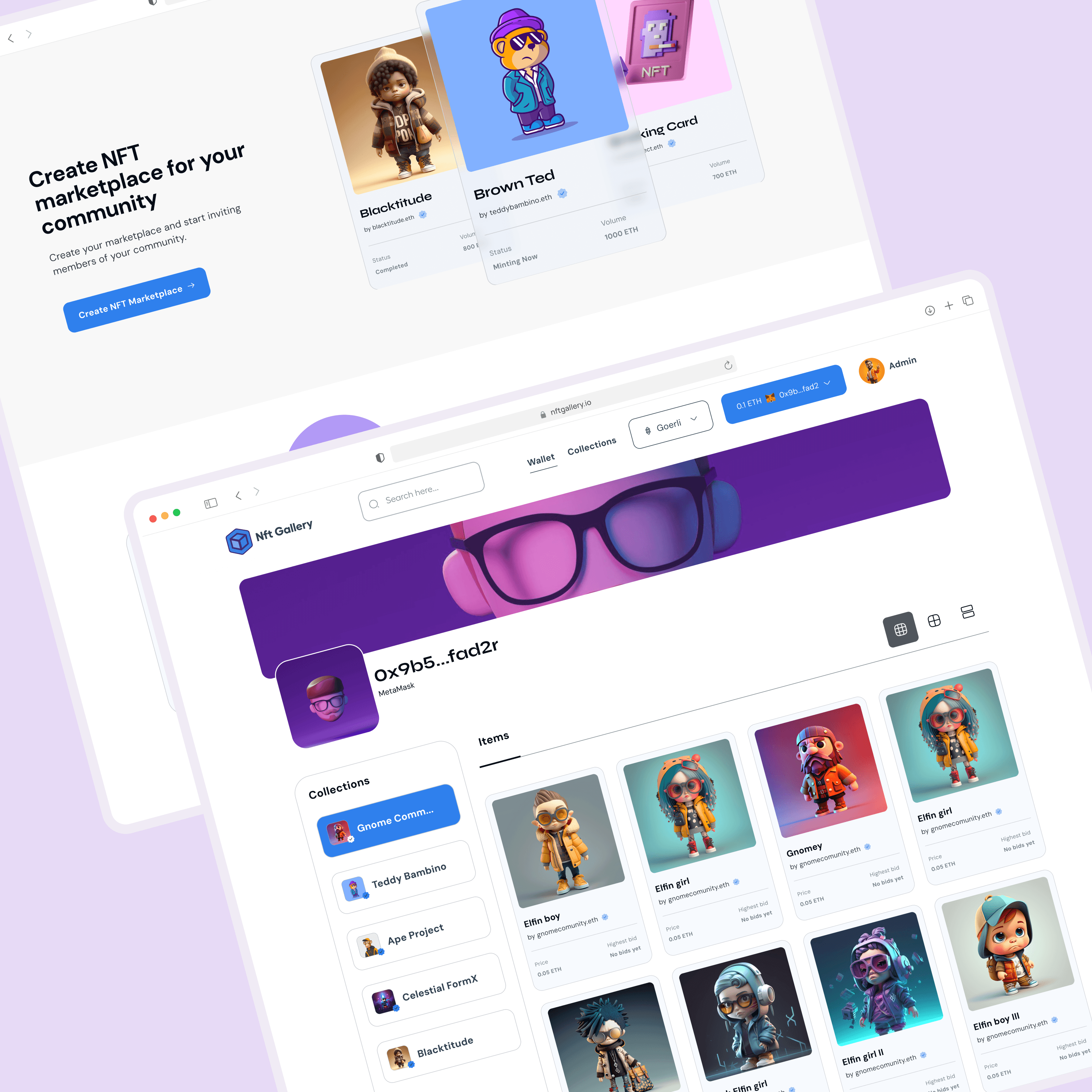 NFT Gallery is a dynamic NFT marketplace aiming to empower creators and connect them with collectors in a vibrant digital ecosystem. The goal was to redesign the marketplace to improve navigation, user engagement, and creator visibility while ensuring the platform appeals to both seasoned NFT enthusiasts and newcomers.