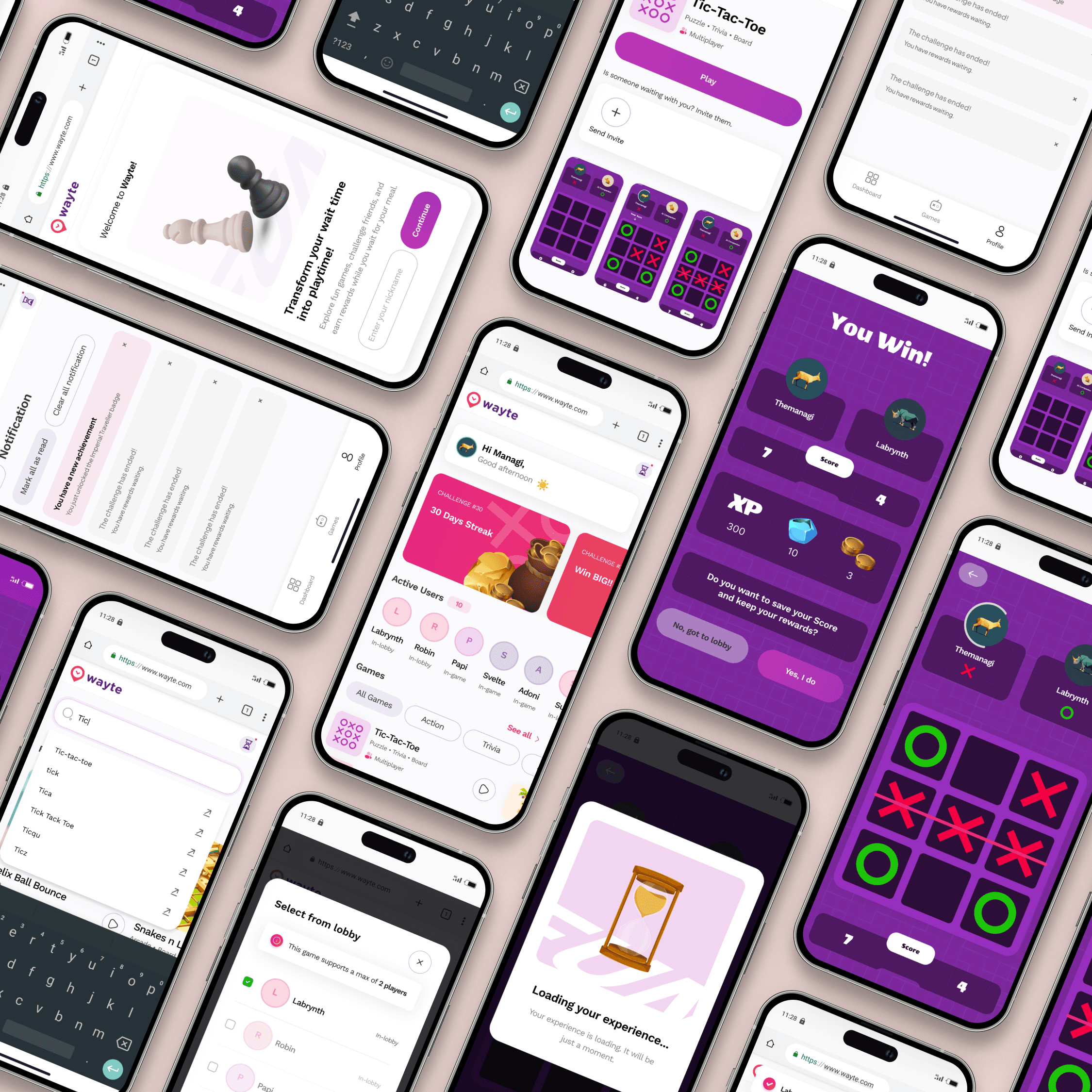Wayte is an experience platform transforming restaurant diners’ wait time into engaging experiences. The objective was to design an experience platform that turns wait times into opportunities for fun and connection, providing diners with engaging, rewarding activities directly from their mobile devices.